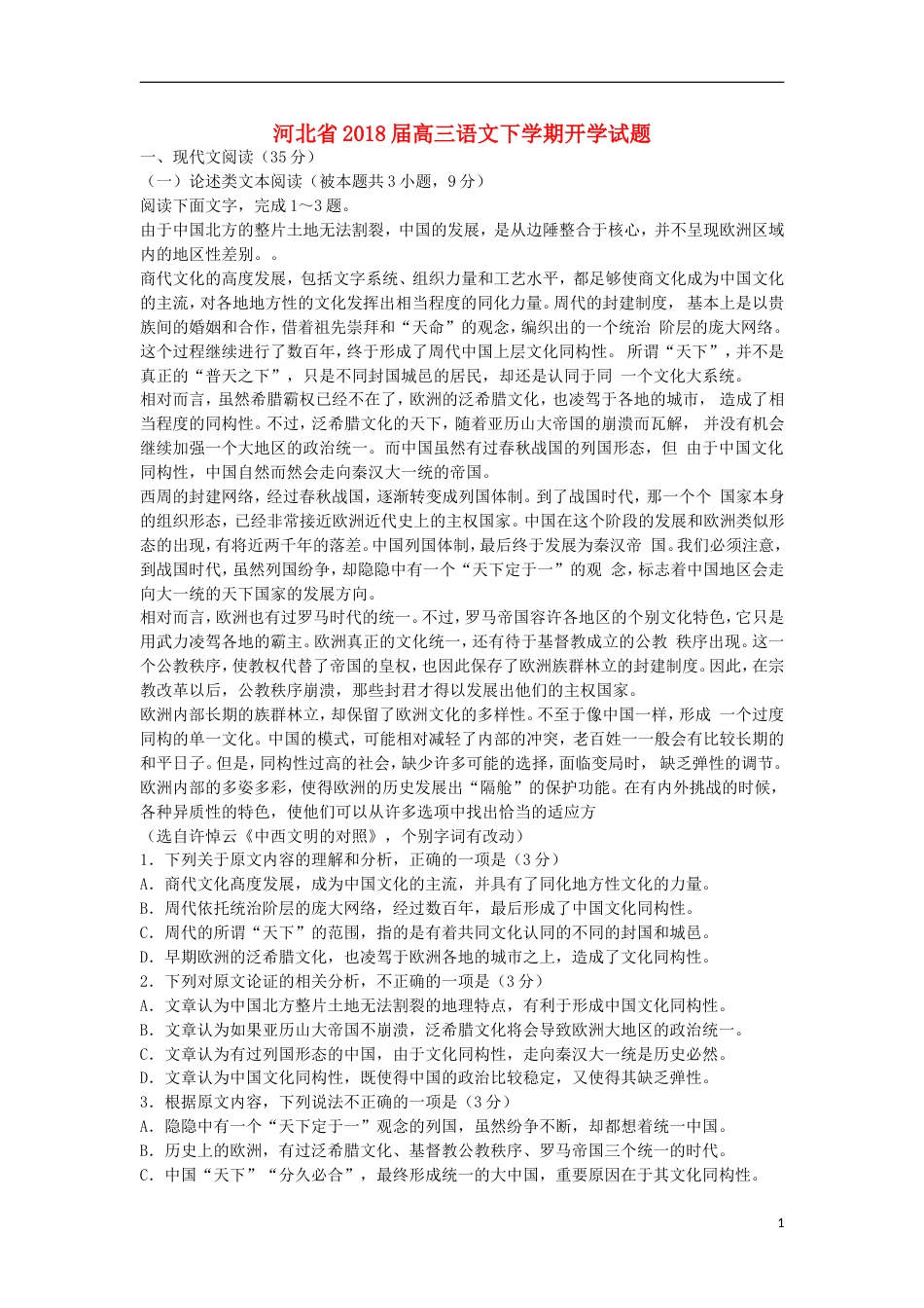 河北省2018届高三语文下学期开学试题一、现代文阅读(35分)(一)论述类文本阅读(被本题共3小题,9分)阅读下面文字,完成1~3题。由于中...