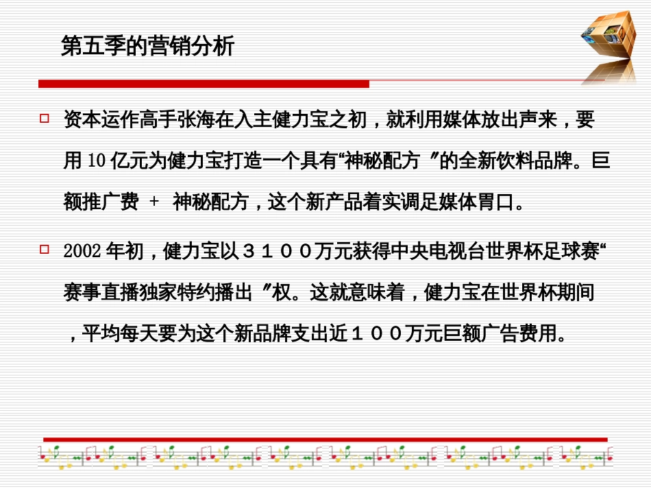 MarketingMarketing第五季的营销分析资本运作高手张海在入主健力宝之初,就利用媒体放出声来,要用10亿元为健力宝打造一个具有“神秘配方...