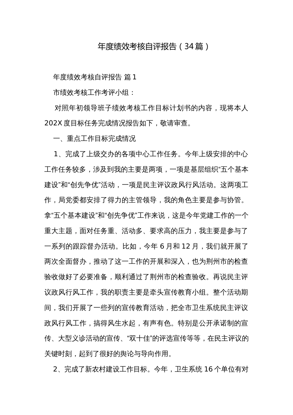 年度绩效考核自评报告(34篇)年度绩效考核自评报告篇1市绩效考核工作考评小组:对照年初领导班子绩效考核工作目标计划书的内容,现将本人2...