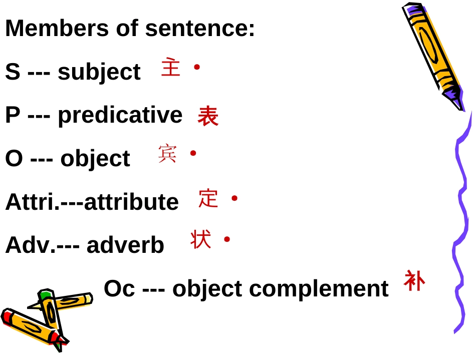 GrammarGrammarsentences句子成份★句子一般由两个部分组成:主语部分(subjectgroup)谓语部分(predicategroup)★句子成份:主·谓·宾...