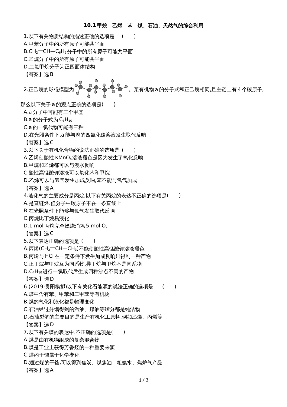 10.1甲烷乙烯苯煤、石油、天然气的综合利用1.以下有关物质结构的描述正确的选项是()A.甲苯分子中的所有原子可能共平面B.CH2CH—C6H5分子中...