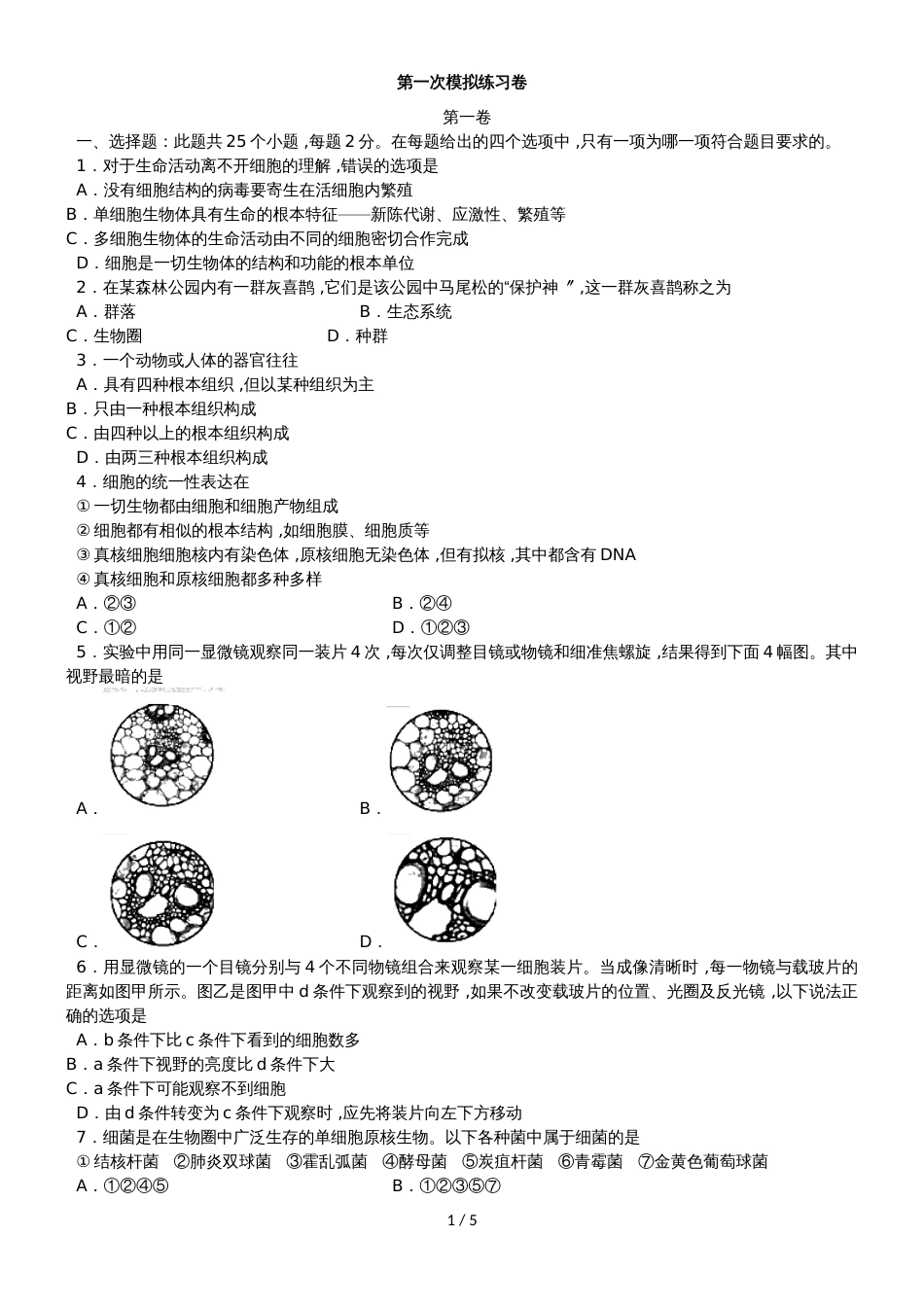 第一次模拟练习卷第一卷一、选择题:此题共25个小题,每题2分。在每题给出的四个选项中,只有一项为哪一项符合题目要求的。1.对于生命活动离...