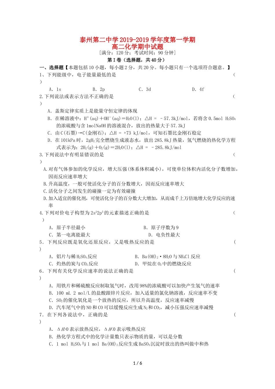 泰州第二中学2019-2019学年度第一学期高二化学期中试题[满分:120分;考试时间:90分钟]第I卷(选择题,共40分)一、选择题【本题包括10小...