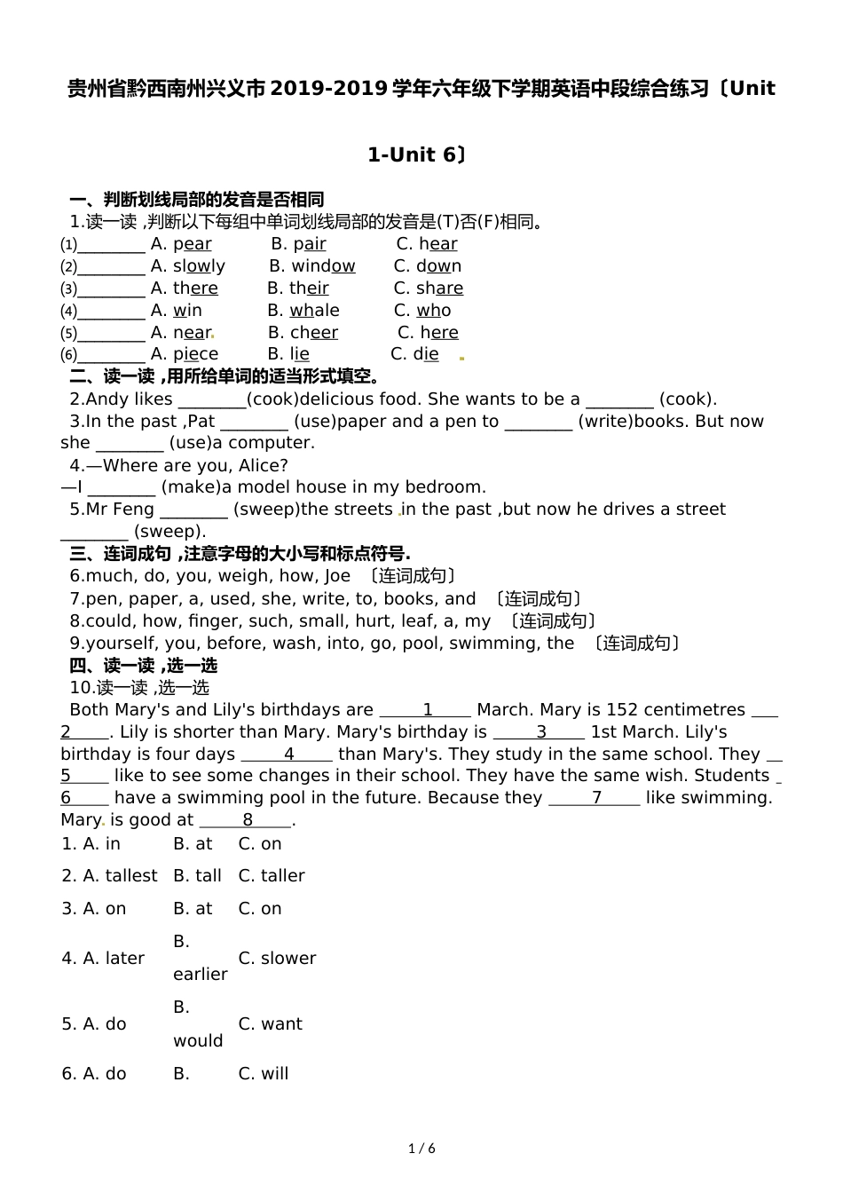 贵州省黔西南州兴义市2019-2019学年六年级下学期英语中段综合练习〔Unit1-Unit6〕一、判断划线局部的发音是否相同1.读一读,判断以下每组中...