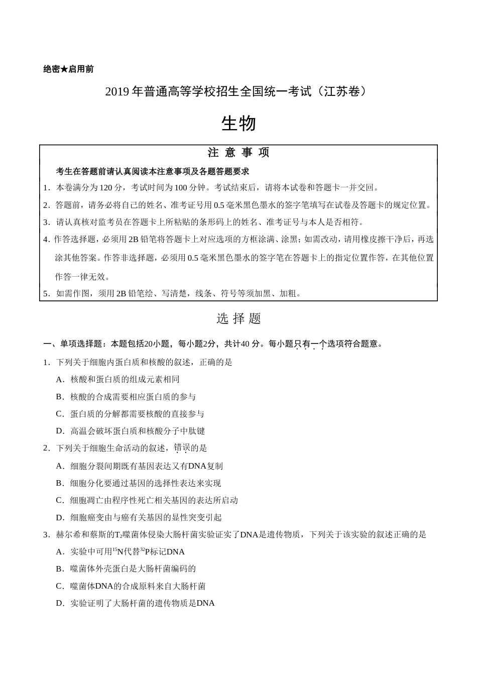 绝密★启用前2019年普通高等学校招生全国统一考试(江苏卷)生物注意事项考生在答题前请认真阅读本注意事项及各题答题要求1.本卷满分为120...