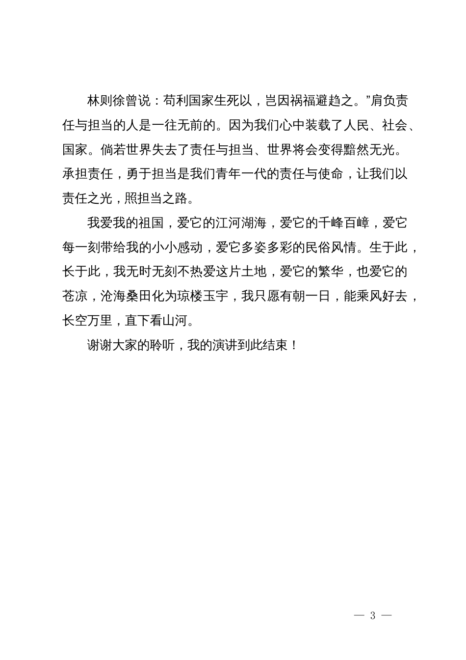 演讲稿:青年以责任之光,照担当之路亲爱的同学们,敬爱的老师们:大家好!我是来自X班的X,很荣幸能作为学生代表在这里演讲。今天我演讲的...