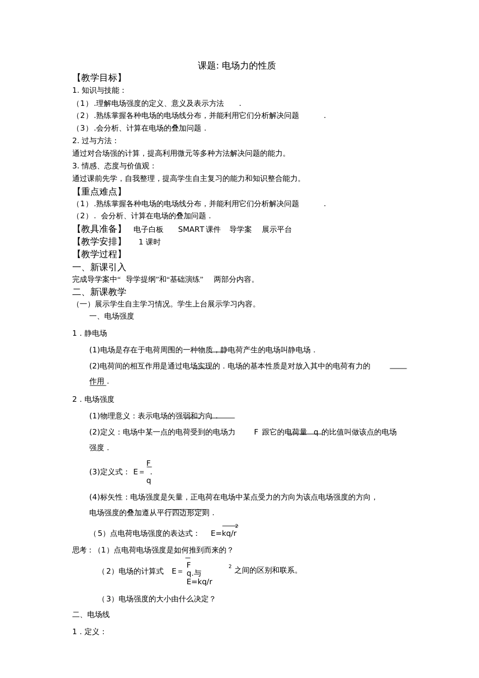 课题:电场力的性质【教学目标】1.知识与技能:(1).理解电场强度的定义、意义及表示方法.(2).熟练掌握各种电场的电场线分布,并能利用它...