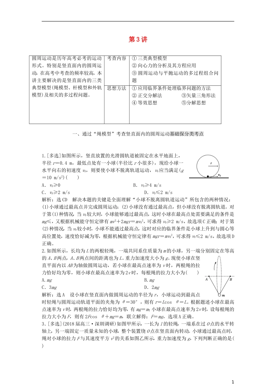 第3讲圆周运动是历年高考必考的运动形式。特别是竖直面内的圆周运动,在高考中考查的频率较高。本讲主要解决的是竖直面内的三类典型模型(绳...