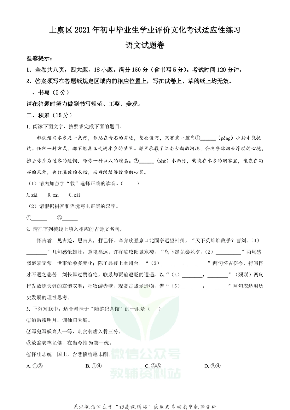 05  2021年浙江省绍兴市上虞区中考适应性练习语文试题_第1页