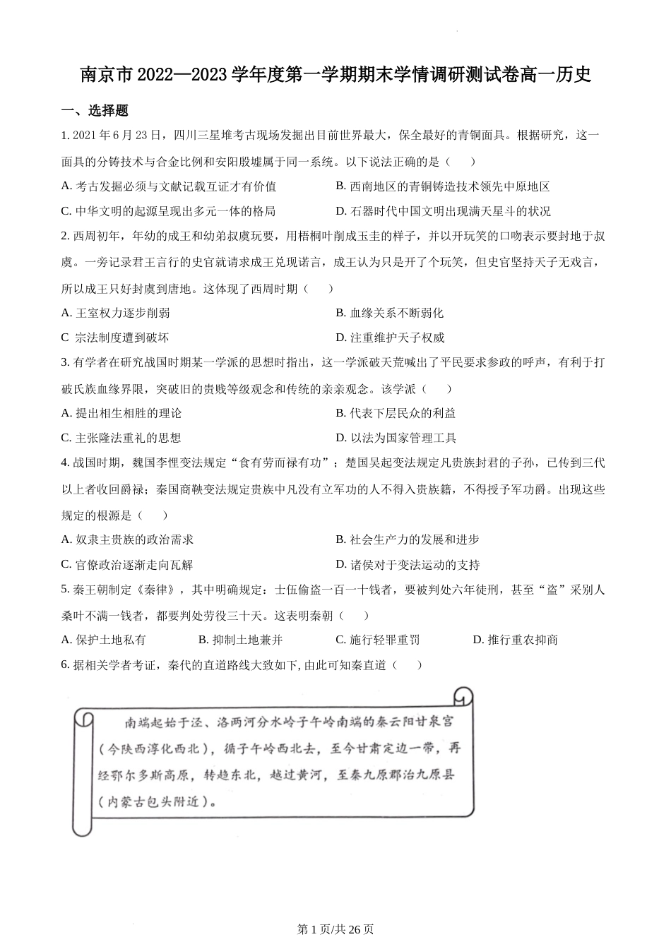 2022-2023学年南京市高一上历史期末学情调研试卷(含答案)_第1页