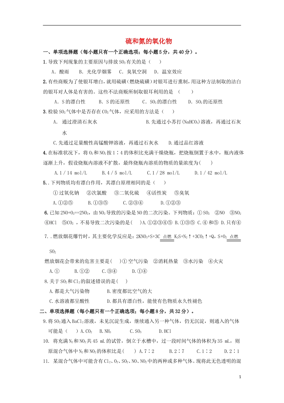 硫和氮的氧化物一、单项选择题(每小题只有一个正确选项;每小题5分,共40分)。1.导致下列现象的主要原因与排放SO2有关的是()A.酸雨B....