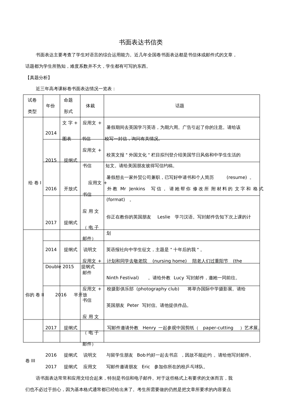 书面表达书信类书面表达主要考查了学生对语言的综合运用能力。近几年全国卷书面表达都是书信体或邮件式的文章,话题都为学生所熟知,难度系...