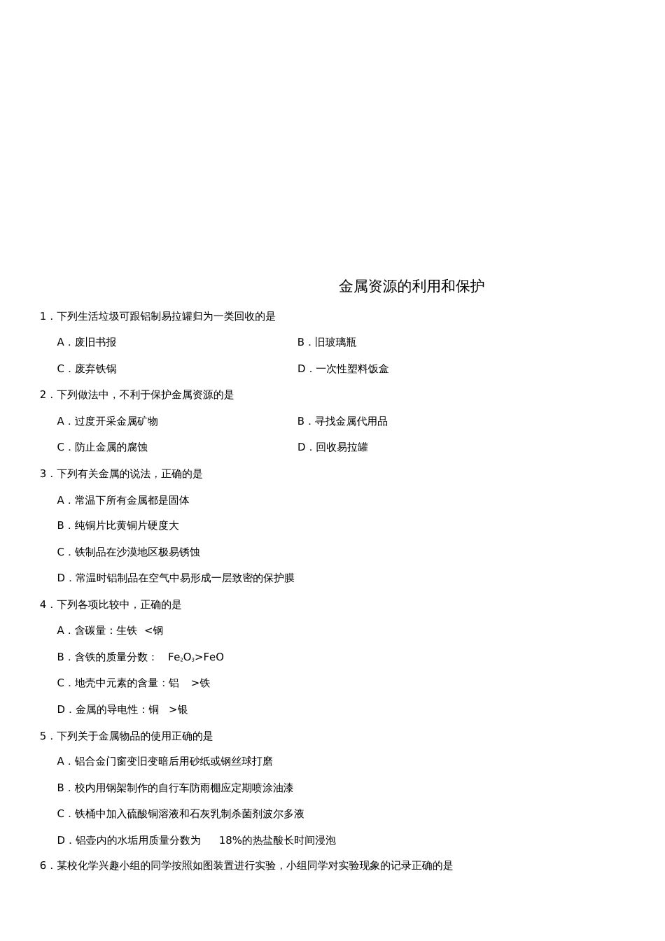 金属资源的利用和保护1.下列生活垃圾可跟铝制易拉罐归为一类回收的是A.废旧书报B.旧玻璃瓶C.废弃铁锅D.一次性塑料饭盒2.下列做法中,...