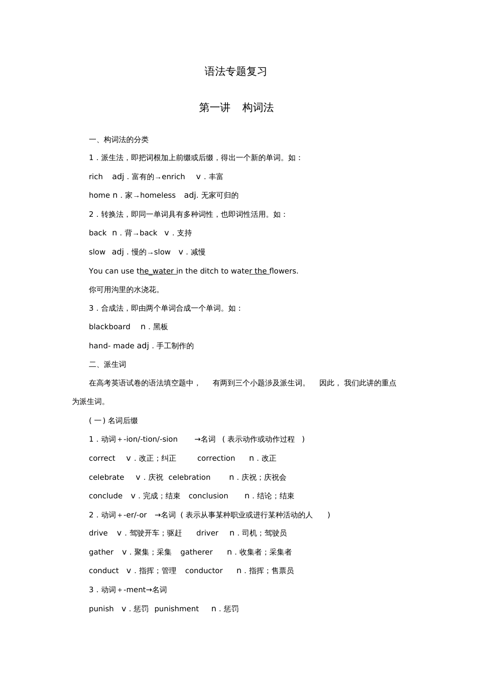 语法专题复习第一讲构词法一、构词法的分类1.派生法,即把词根加上前缀或后缀,得出一个新的单词。如:richadj.富有的→enrichv.丰富home...