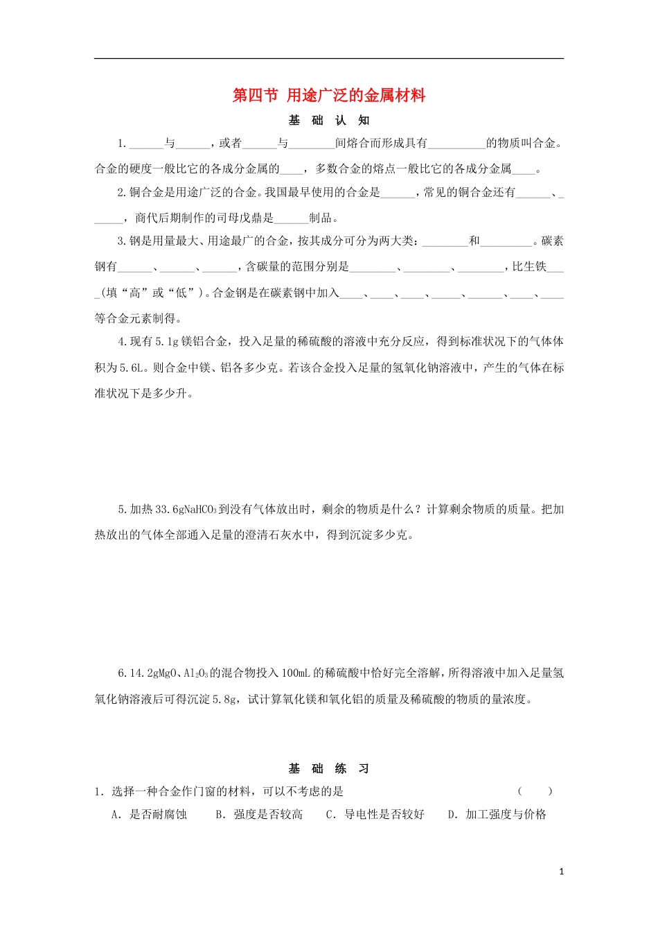 第四节用途广泛的金属材料基础认知1.______与______,或者______与________间熔合而形成具有__________的物质叫合金。合金的硬度一般比它的...