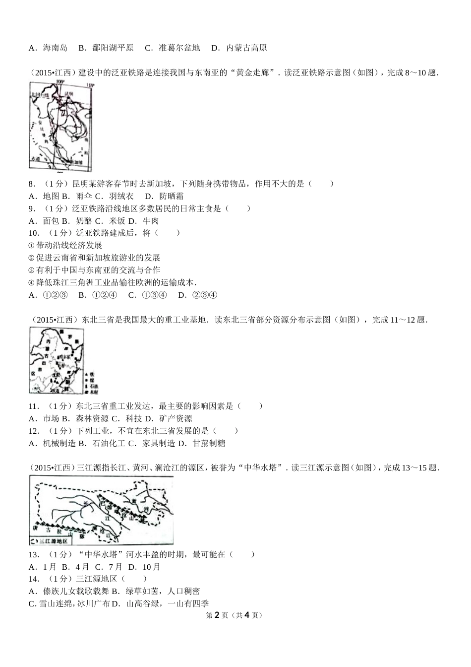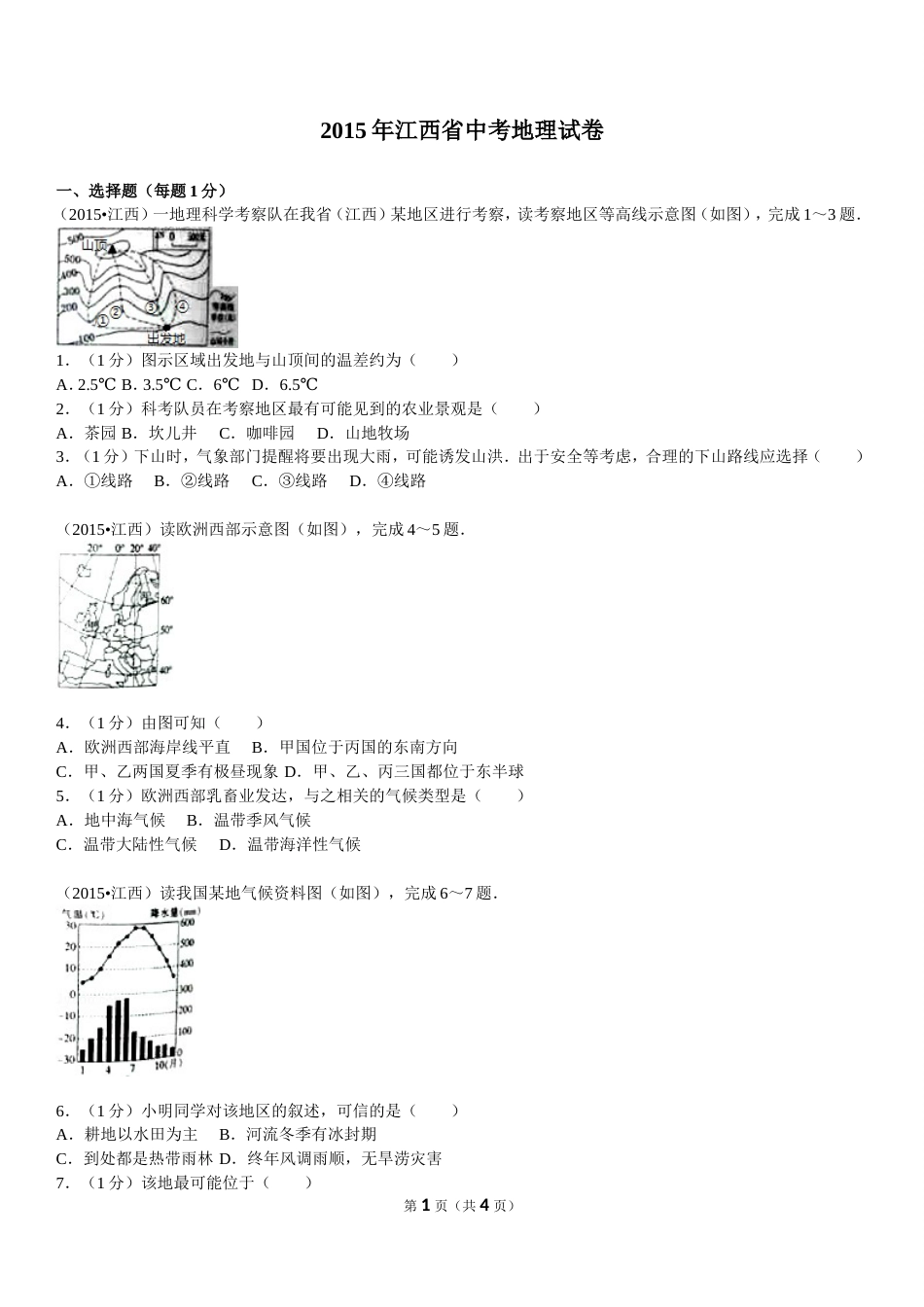 2015年江西省中考地理试卷一、选择题(每题1分)(2015•江西)一地理科学考察队在我省(江西)某地区进行考察,读考察地区等高线示意图(...