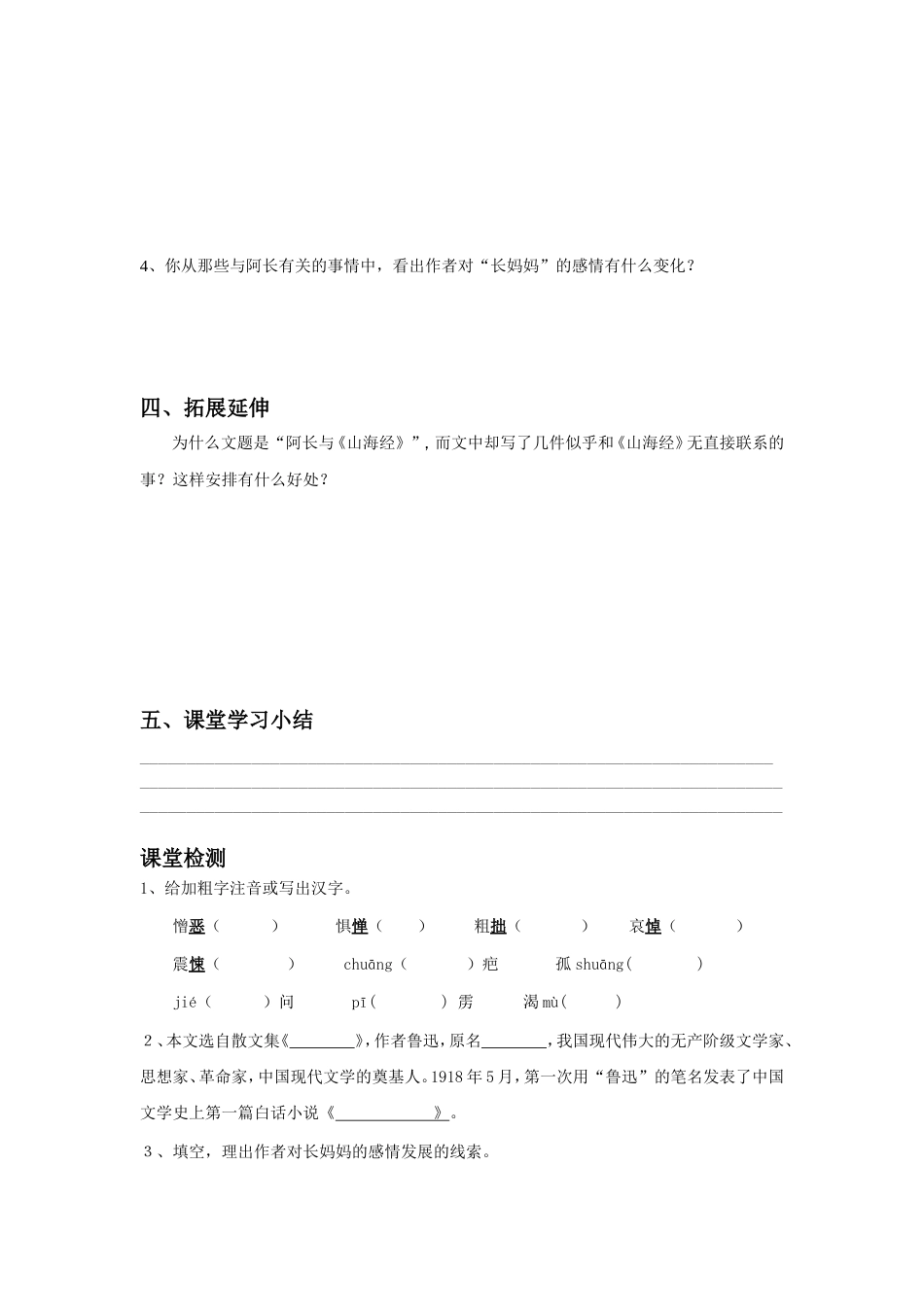 6、阿长与《山海经》(第一课时)日期班级姓名组别评价学习目标1、.熟读课文,学习并掌握文中的生字新词,积累重要词汇。2、整体把握课文,...