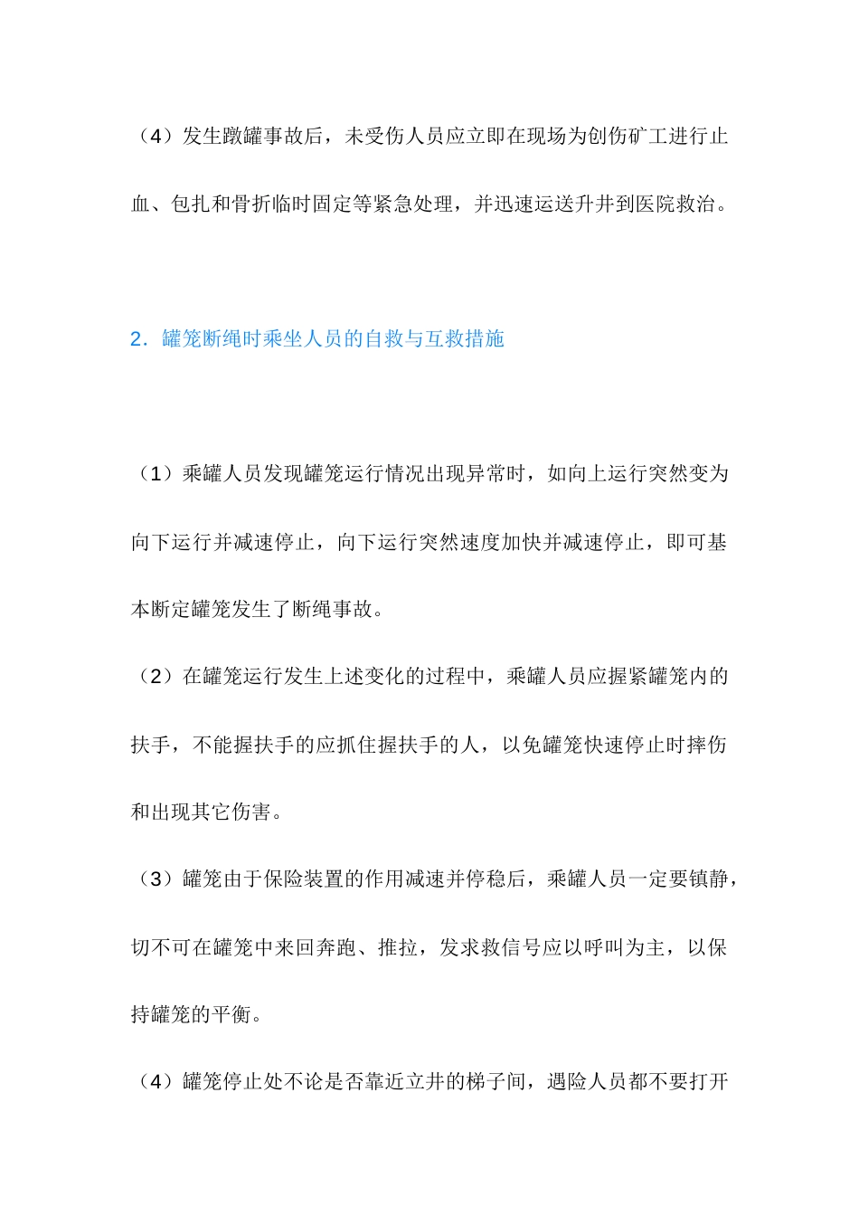 1.蹾罐时乘坐人员的自救与互救措施蹾罐是矿井提升运输中发生较多的一种事故。它对乘坐人员的伤害是向罐笼底部的强烈冲击,可造成腿部骨折...