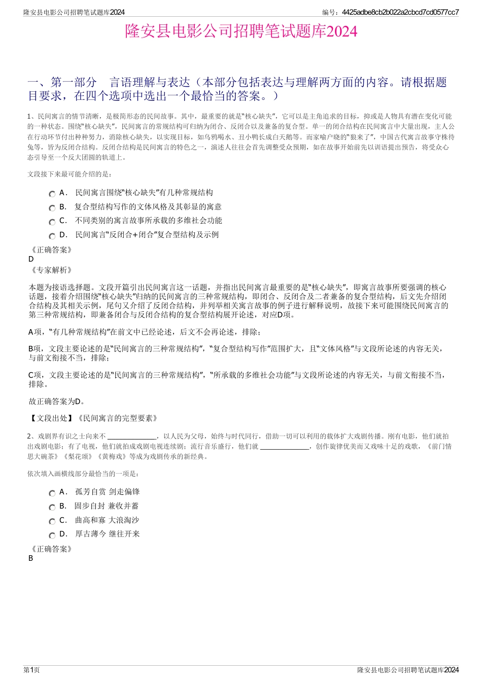 隆安县电影公司招聘笔试题库2024一、第一部分言语理解与表达(本部分包括表达与理解两方面的内容。请根据题目要求,在四个选项中选出一个最...