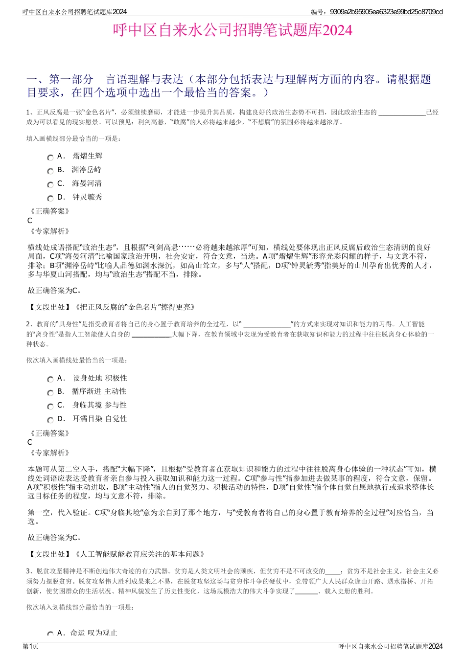 呼中区自来水公司招聘笔试题库2024一、第一部分言语理解与表达(本部分包括表达与理解两方面的内容。请根据题目要求,在四个选项中选出一个...