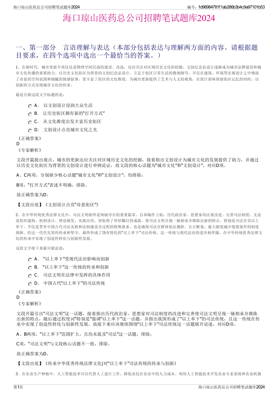 海口琼山医药总公司招聘笔试题库2024一、第一部分言语理解与表达(本部分包括表达与理解两方面的内容。请根据题目要求,在四个选项中选出一...