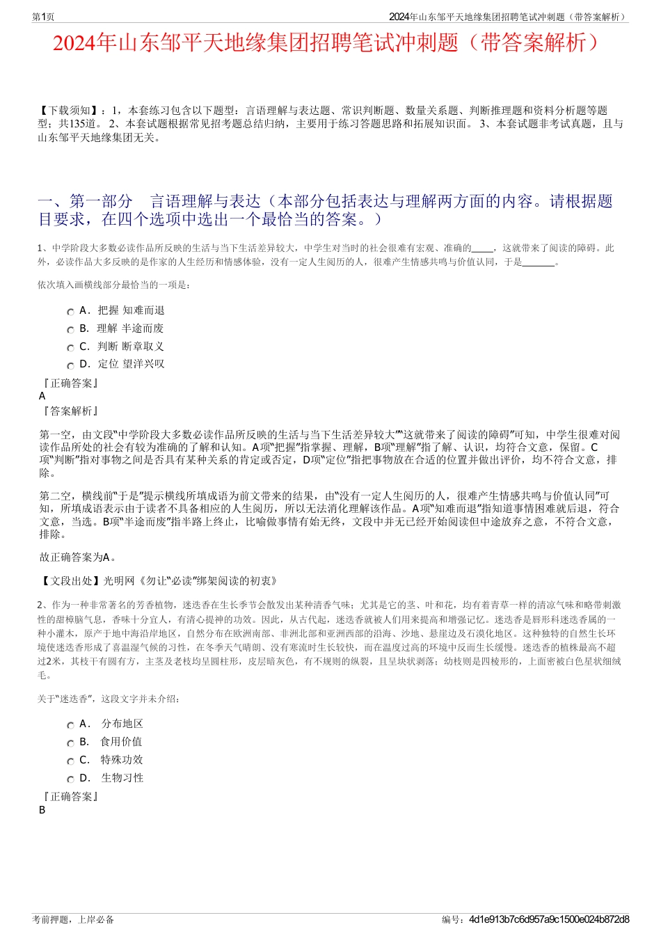 2024年山东邹平天地缘集团招聘笔试冲刺题(带答案解析)【下载须知】:1,本套练习包含以下题型:言语理解与表达题、常识判断题、数量关系...