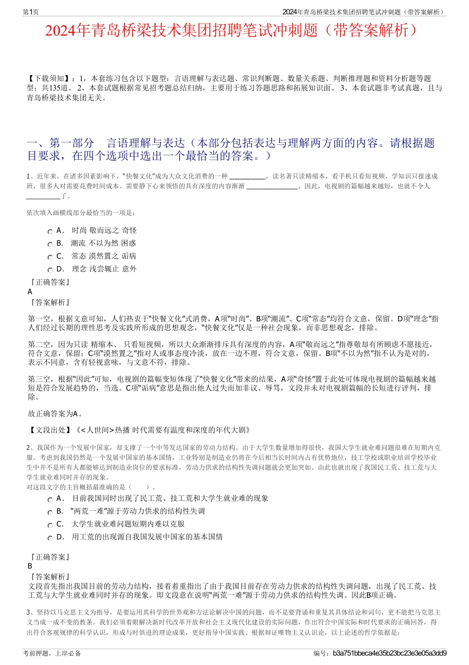 2024年青岛桥梁技术集团招聘笔试冲刺题(带答案解析)【下载须知】:1,本套练习包含以下题型:言语理解与表达题、常识判断题、数量关系题...