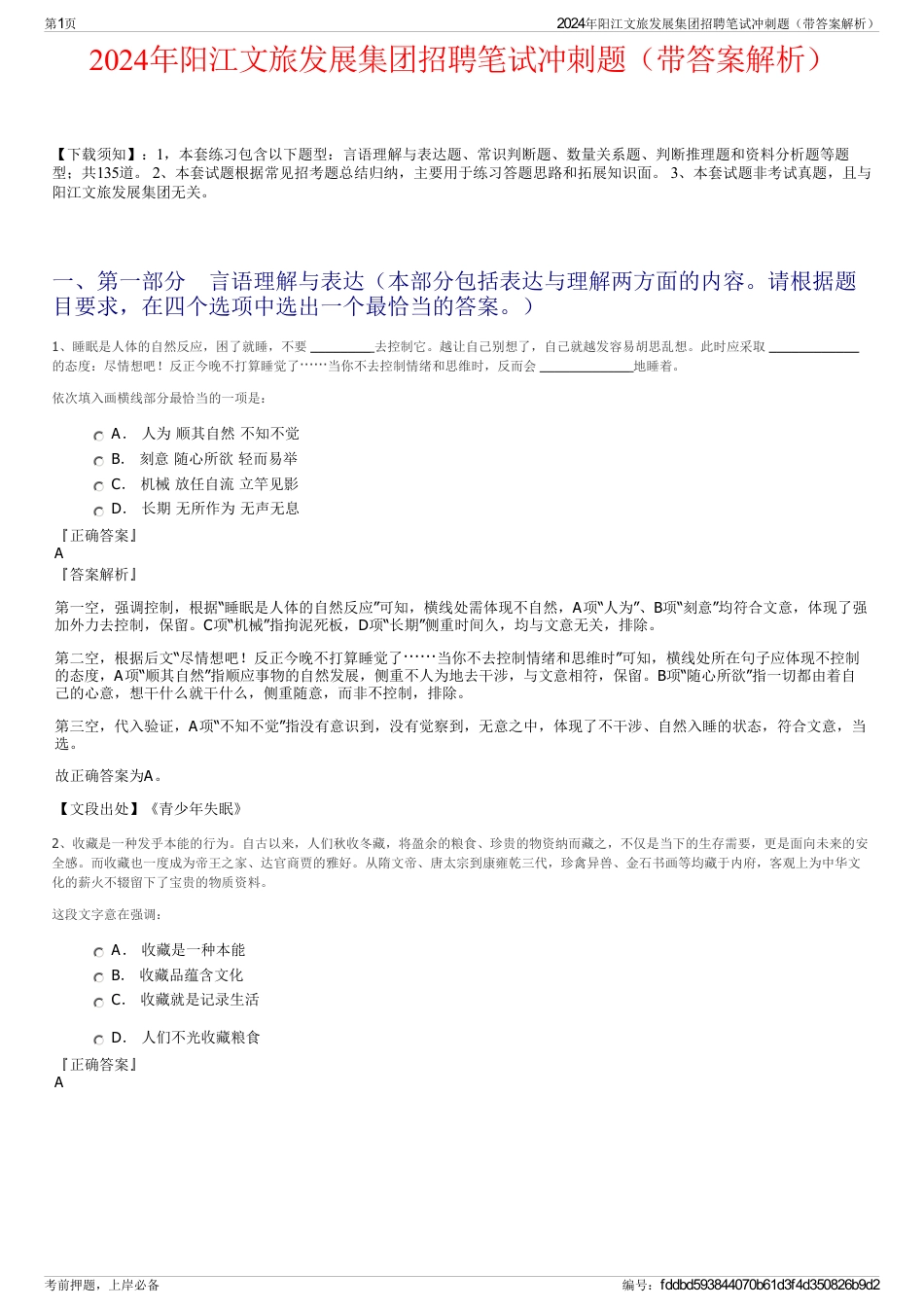 2024年阳江文旅发展集团招聘笔试冲刺题(带答案解析)【下载须知】:1,本套练习包含以下题型:言语理解与表达题、常识判断题、数量关系题...