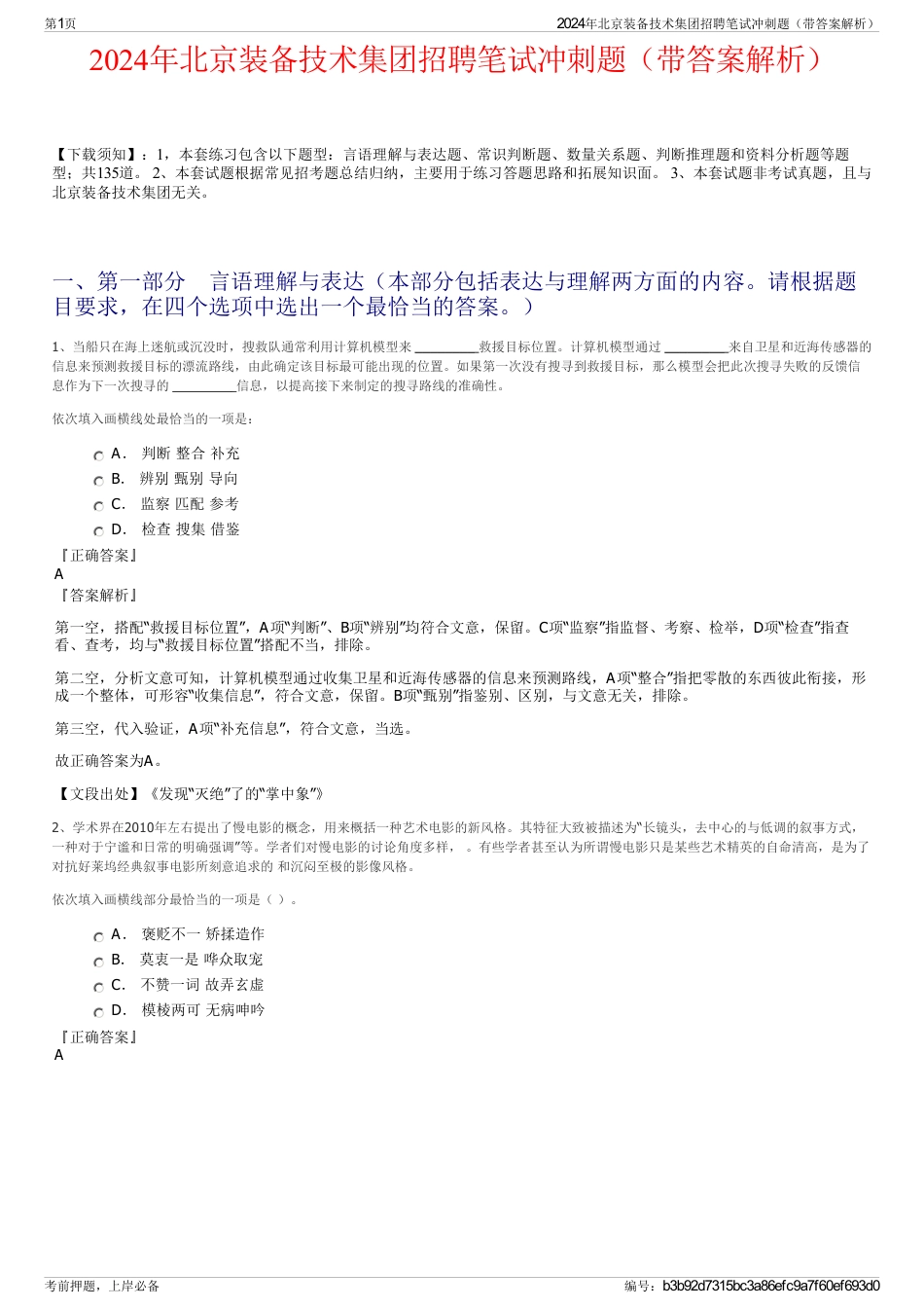 2024年北京装备技术集团招聘笔试冲刺题(带答案解析)【下载须知】:1,本套练习包含以下题型:言语理解与表达题、常识判断题、数量关系题...