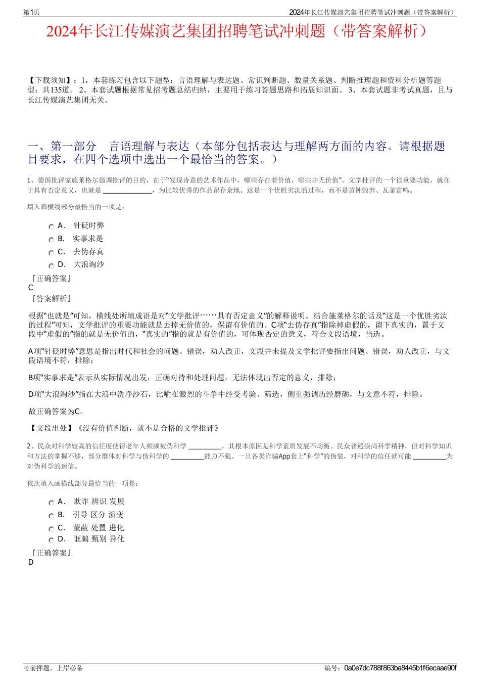 2024年长江传媒演艺集团招聘笔试冲刺题(带答案解析)【下载须知】:1,本套练习包含以下题型:言语理解与表达题、常识判断题、数量关系题...