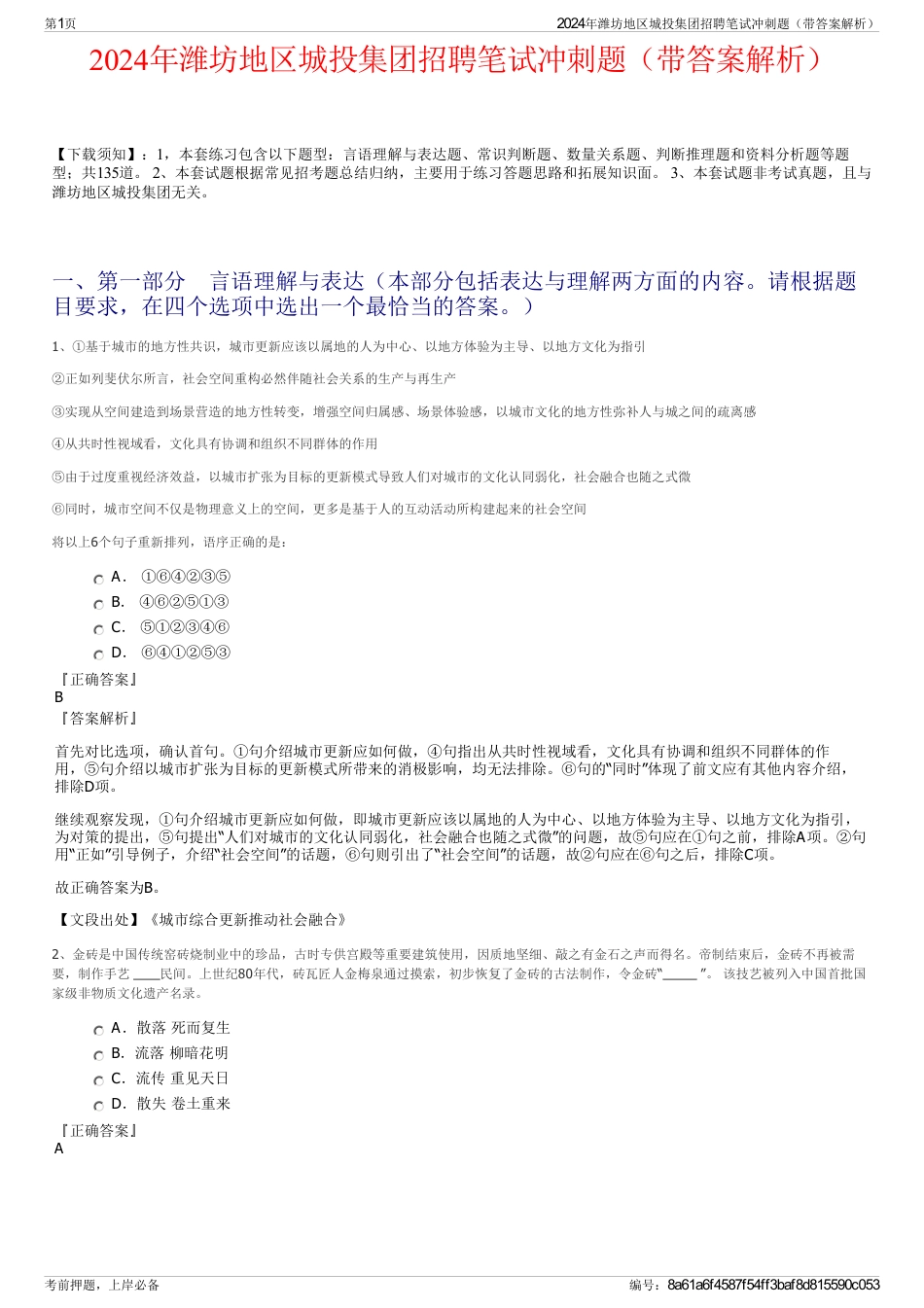 2024年潍坊地区城投集团招聘笔试冲刺题(带答案解析)【下载须知】:1,本套练习包含以下题型:言语理解与表达题、常识判断题、数量关系题...