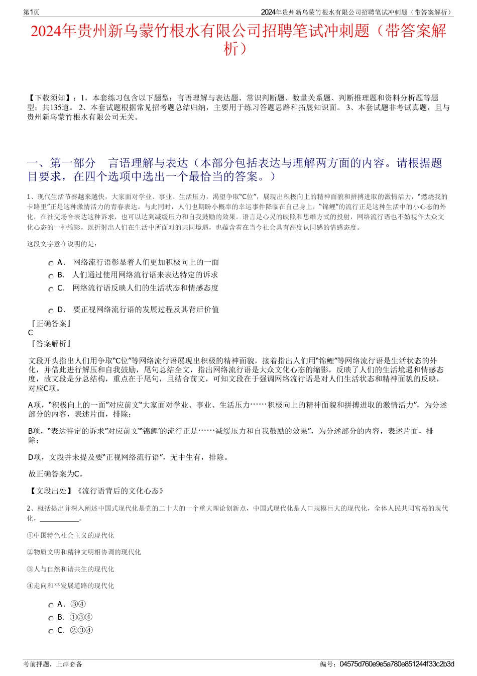 2024年贵州新乌蒙竹根水有限公司招聘笔试冲刺题(带答案解析)【下载须知】:1,本套练习包含以下题型:言语理解与表达题、常识判断题、数...