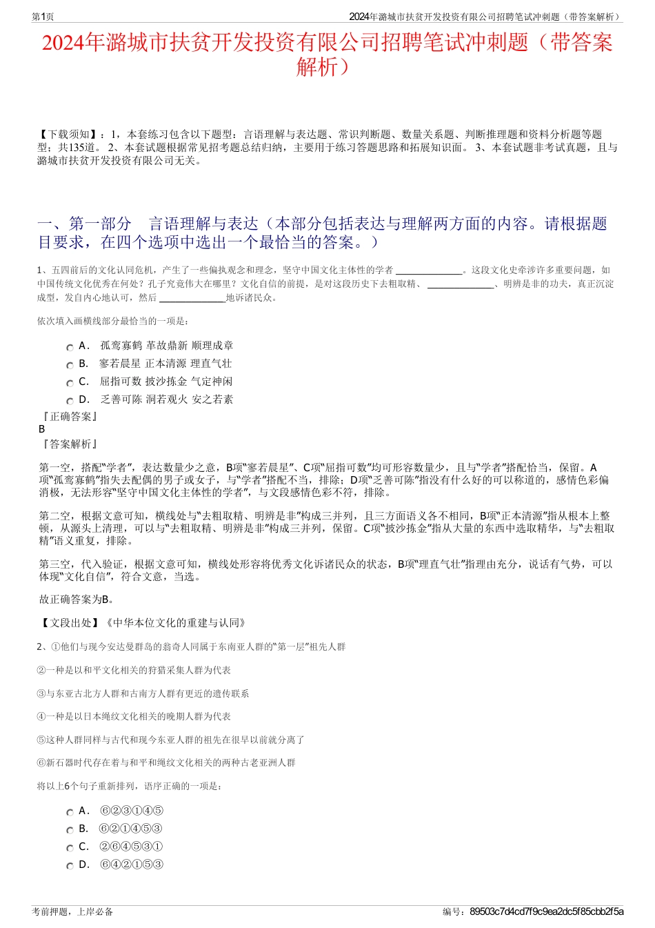 2024年潞城市扶贫开发投资有限公司招聘笔试冲刺题(带答案解析)【下载须知】:1,本套练习包含以下题型:言语理解与表达题、常识判断题、...
