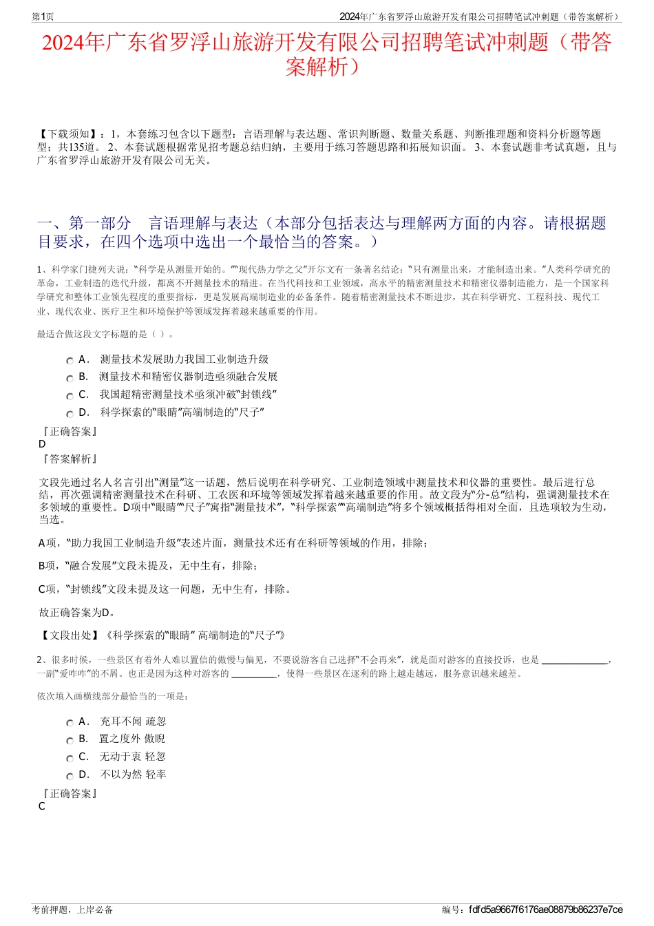 2024年广东省罗浮山旅游开发有限公司招聘笔试冲刺题(带答案解析)【下载须知】:1,本套练习包含以下题型:言语理解与表达题、常识判断题...