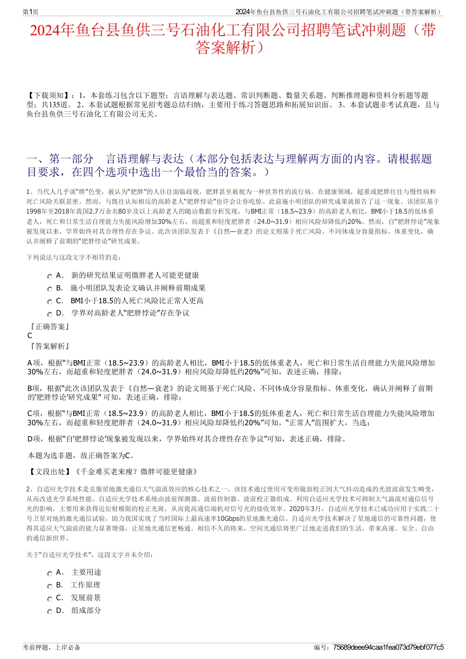 2024年鱼台县鱼供三号石油化工有限公司招聘笔试冲刺题(带答案解析)【下载须知】:1,本套练习包含以下题型:言语理解与表达题、常识判断...