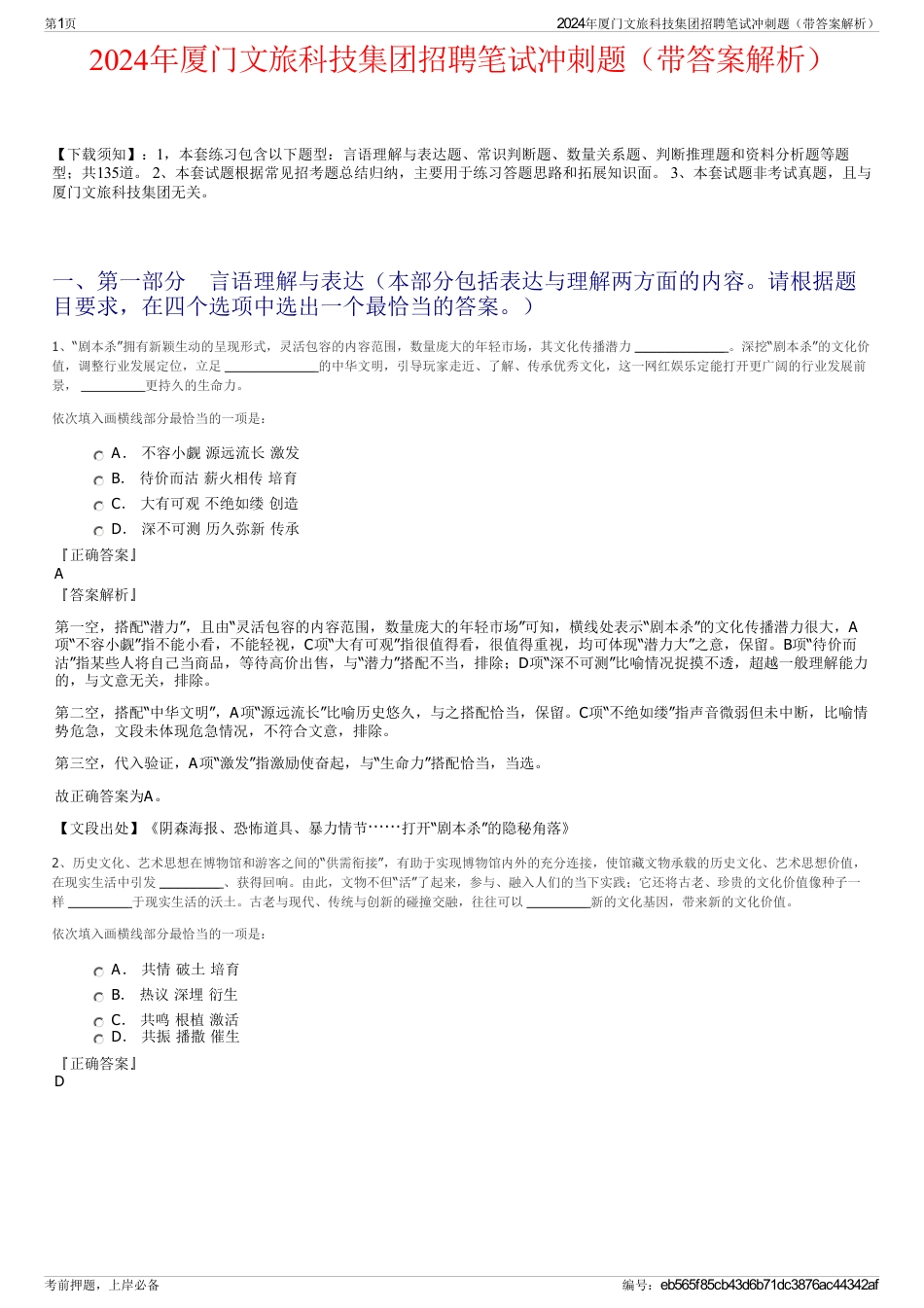 2024年厦门文旅科技集团招聘笔试冲刺题(带答案解析)【下载须知】:1,本套练习包含以下题型:言语理解与表达题、常识判断题、数量关系题...