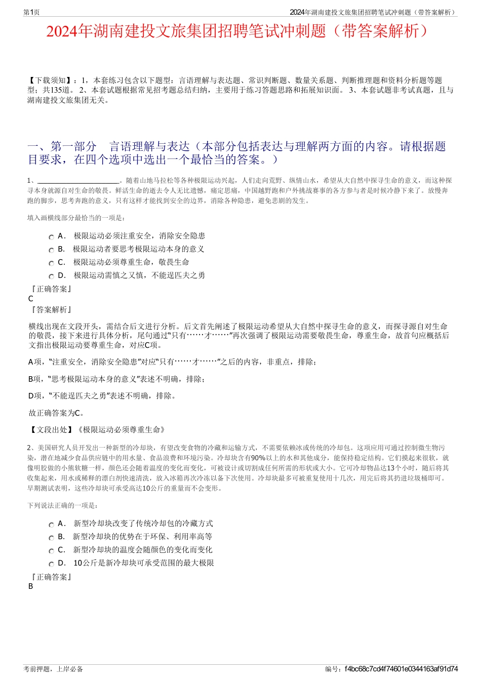 2024年湖南建投文旅集团招聘笔试冲刺题(带答案解析)【下载须知】:1,本套练习包含以下题型:言语理解与表达题、常识判断题、数量关系题...
