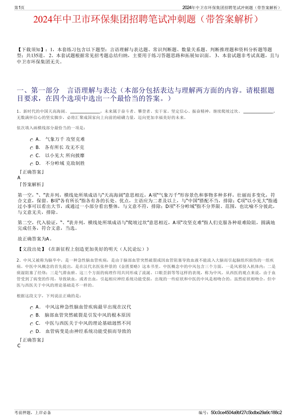 2024年中卫市环保集团招聘笔试冲刺题(带答案解析)【下载须知】:1,本套练习包含以下题型:言语理解与表达题、常识判断题、数量关系题、...
