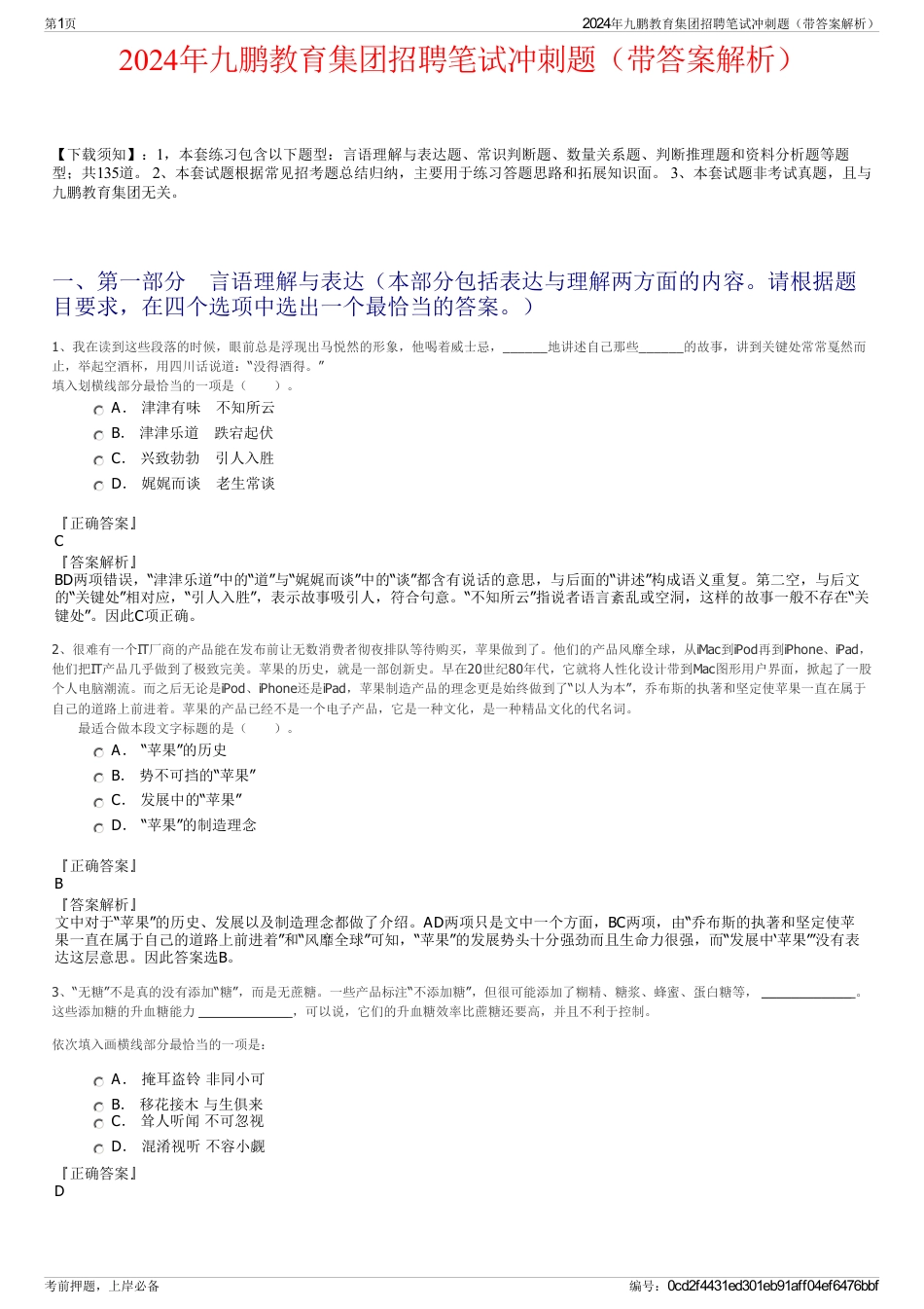 2024年九鹏教育集团招聘笔试冲刺题(带答案解析)【下载须知】:1,本套练习包含以下题型:言语理解与表达题、常识判断题、数量关系题、判...