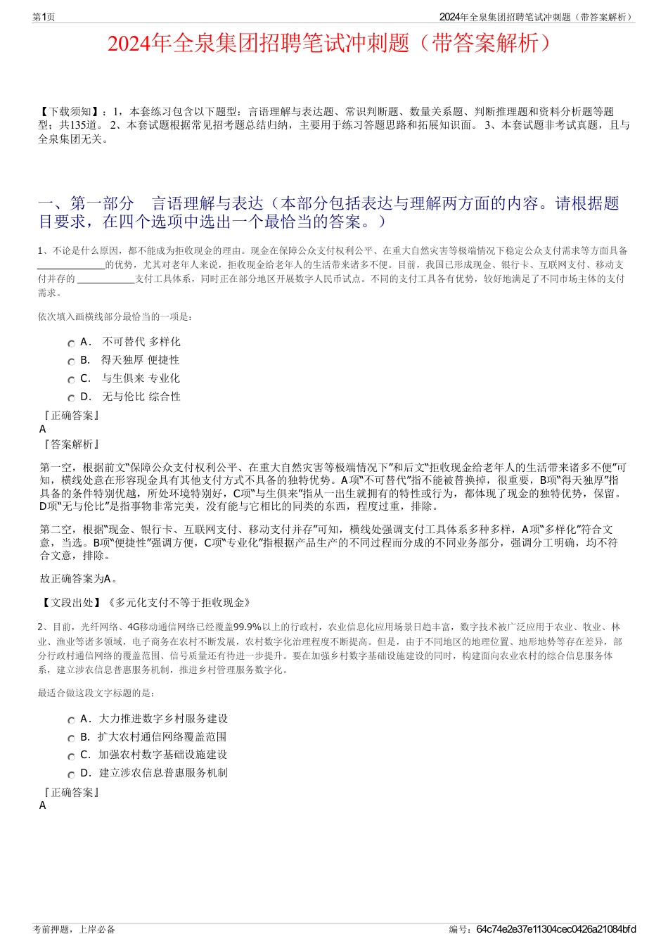 2024年全泉集团招聘笔试冲刺题(带答案解析)_第1页