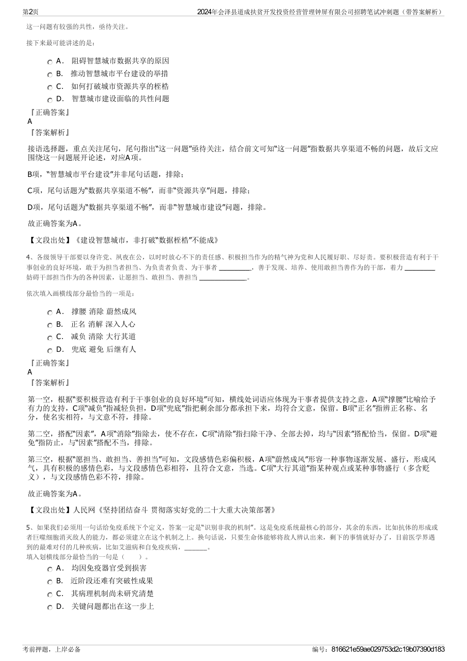 2024年会泽县道成扶贫开发投资经营管理钟屏有限公司招聘笔试冲刺题(带答案解析)【下载须知】:1,本套练习包含以下题型:言语理解与表达...