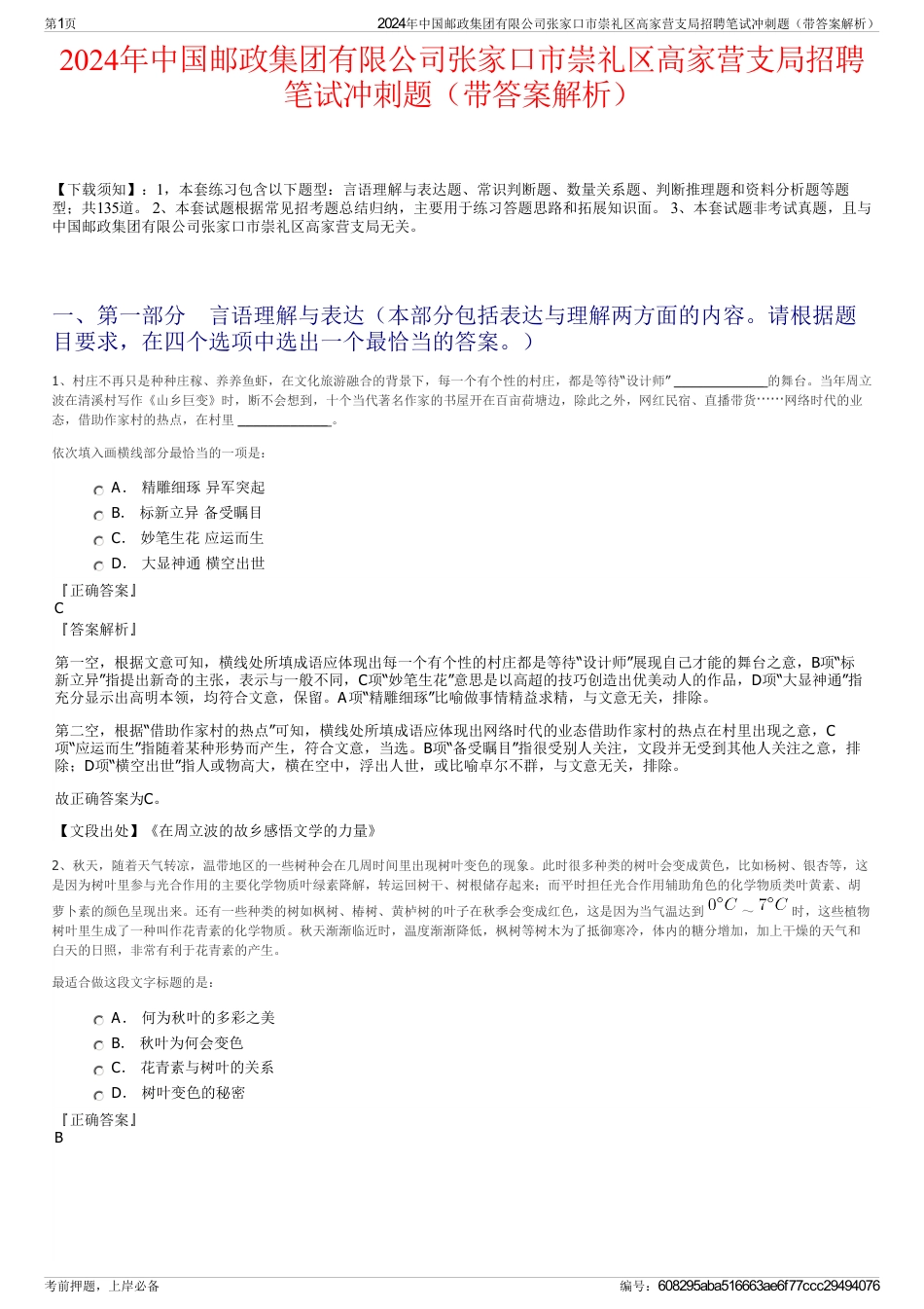 2024年中国邮政集团有限公司张家口市崇礼区高家营支局招聘笔试冲刺题(带答案解析)【下载须知】:1,本套练习包含以下题型:言语理解与表...
