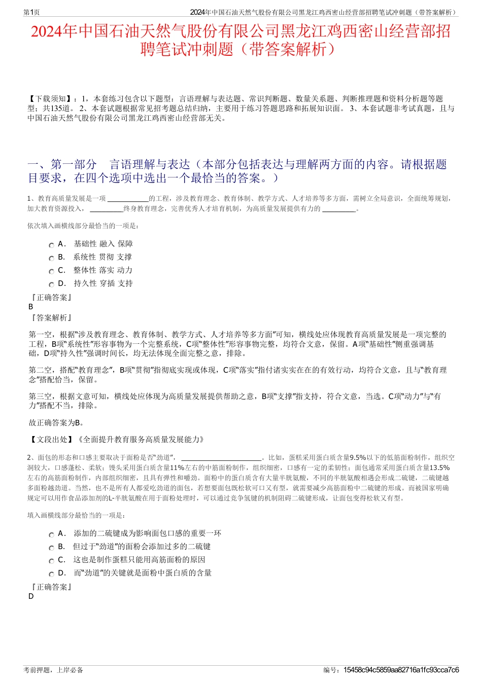 2024年中国石油天然气股份有限公司黑龙江鸡西密山经营部招聘笔试冲刺题(带答案解析)【下载须知】:1,本套练习包含以下题型:言语理解与...