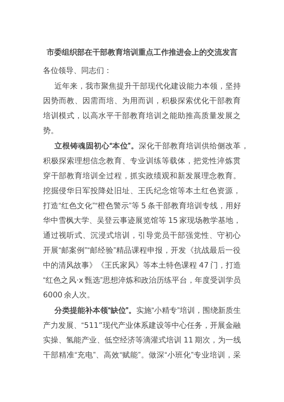 市委组织部在干部教育培训重点工作推进会上的交流发言_第1页