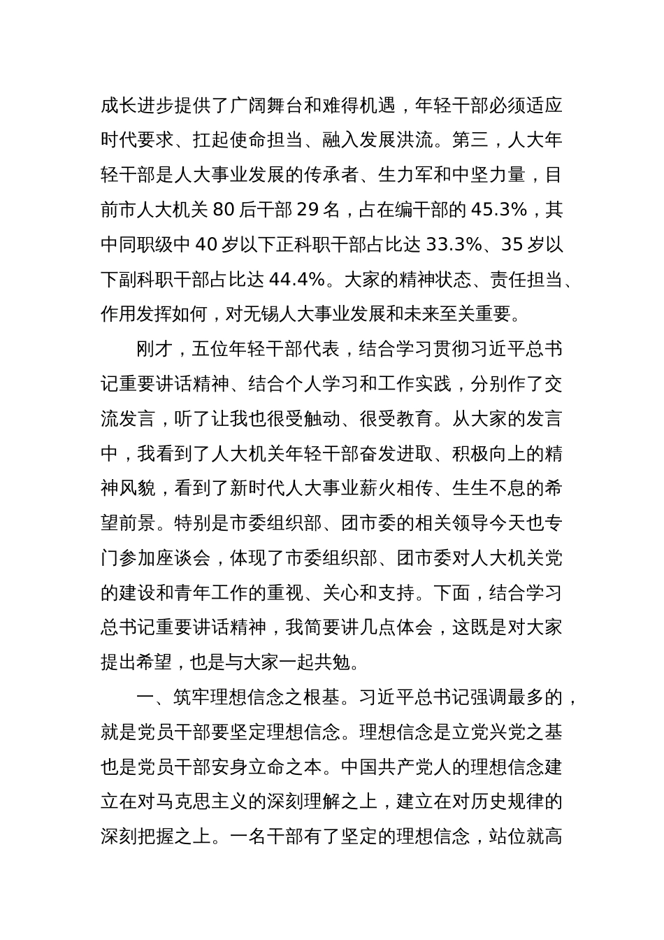 青年干部座谈会讲话“五四”青年节刚过,我们就召开市人大机关年轻干部座谈会,很有意义,很有必要。来人大工作前,我听徐一平主任说,市人...