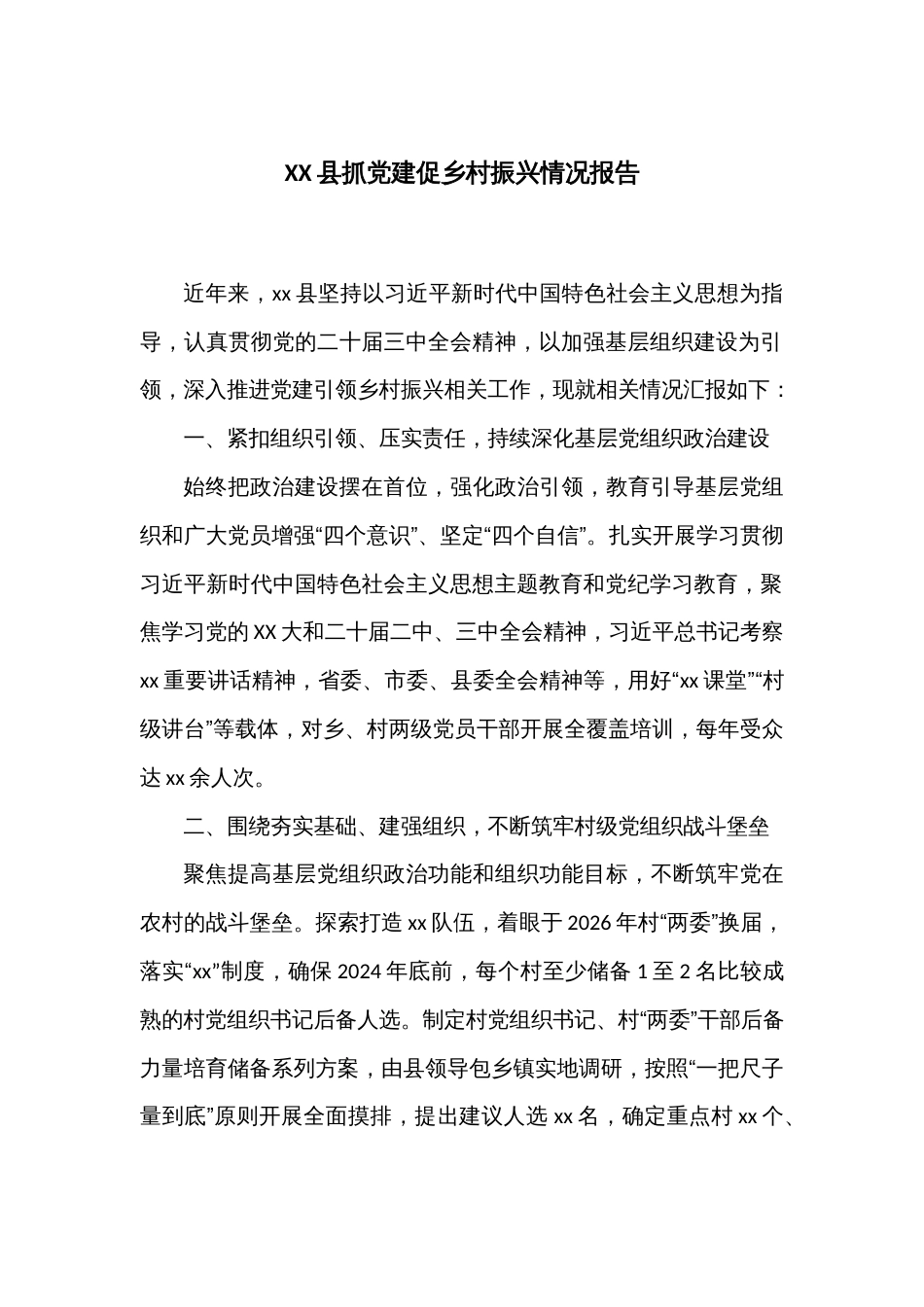 XX县抓党建促乡村振兴情况报告近年来,xx县坚持以习近平新时代中国特色社会主义思想为指导,认真贯彻党的二十届三中全会精神,以加强基层组...