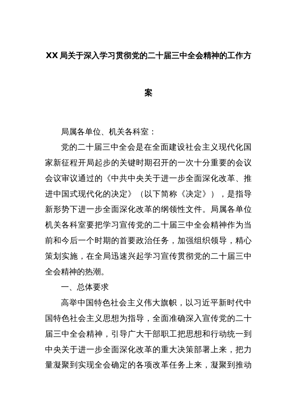 XX局关于深入学习贯彻党的二十届三中全会精神的工作方案局属各单位、机关各科室:党的二十届三中全会是在全面建设社会主义现代化国家新征程...