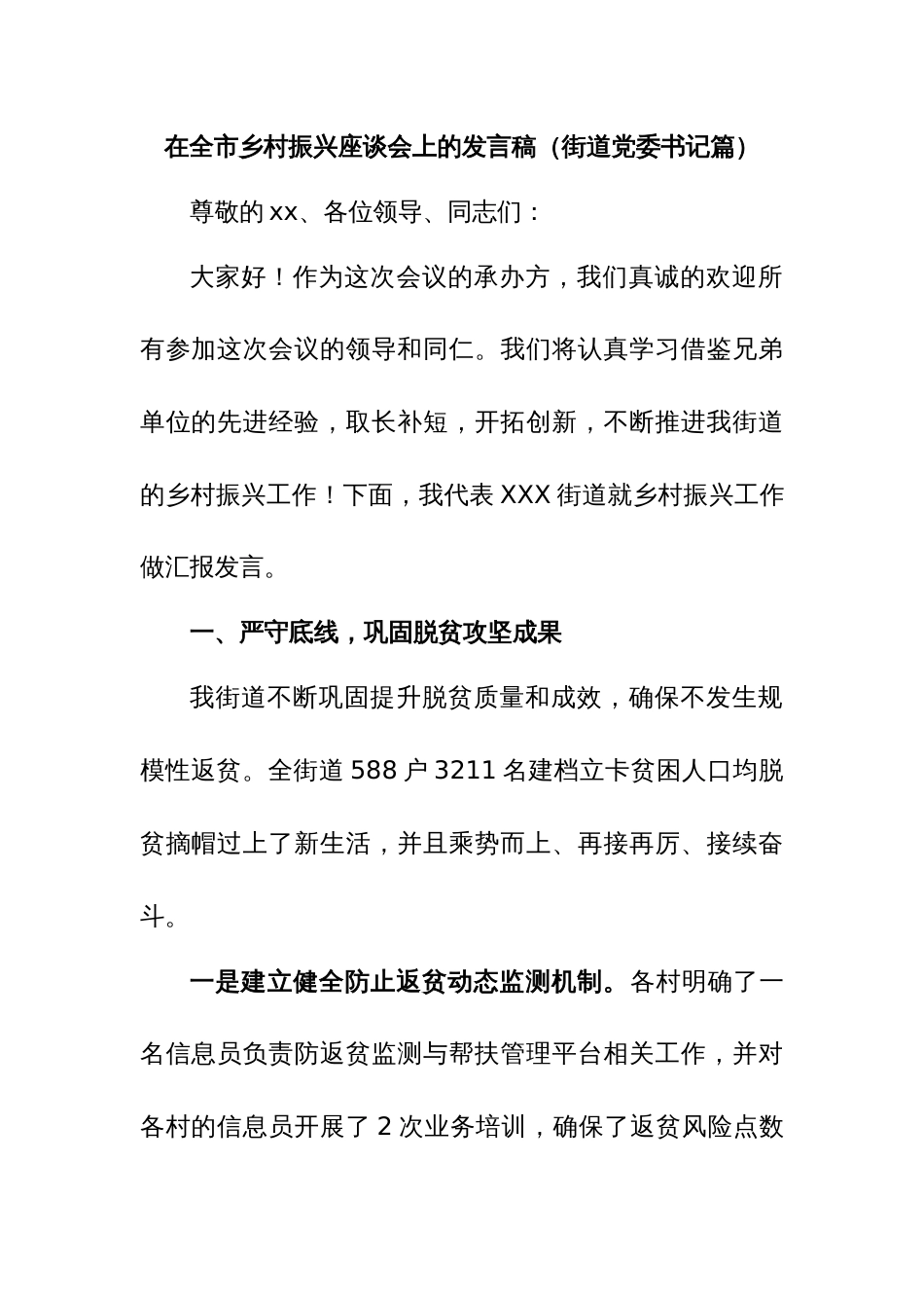 在全市乡村振兴座谈会上的发言稿(街道党委书记篇)尊敬的xx、各位领导、同志们:大家好!作为这次会议的承办方,我们真诚的欢迎所有参加这...