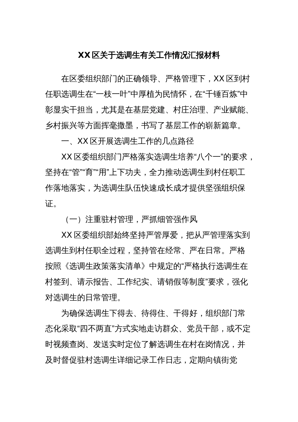 XX区关于选调生有关工作情况汇报材料在区委组织部门的正确领导、严格管理下,XX区到村任职选调生在“一枝一叶”中厚植为民情怀,在“千锤百...