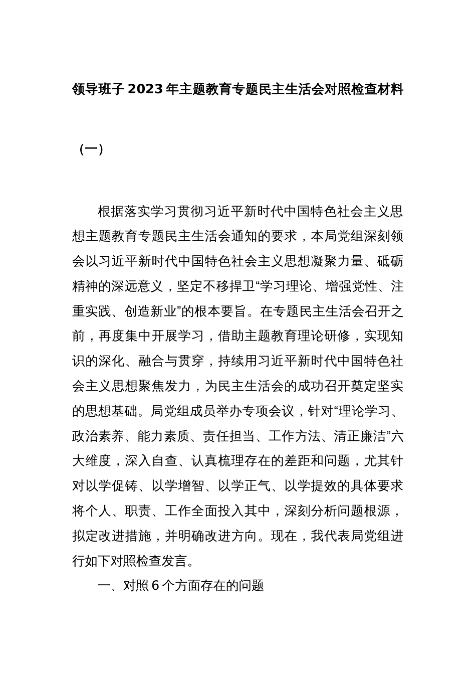领导班子2023年主题教育专题民主生活会对照检查材料(一)根据落实学习贯彻习近平新时代中国特色社会主义思想主题教育专题民主生活会通知的...